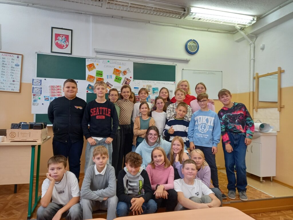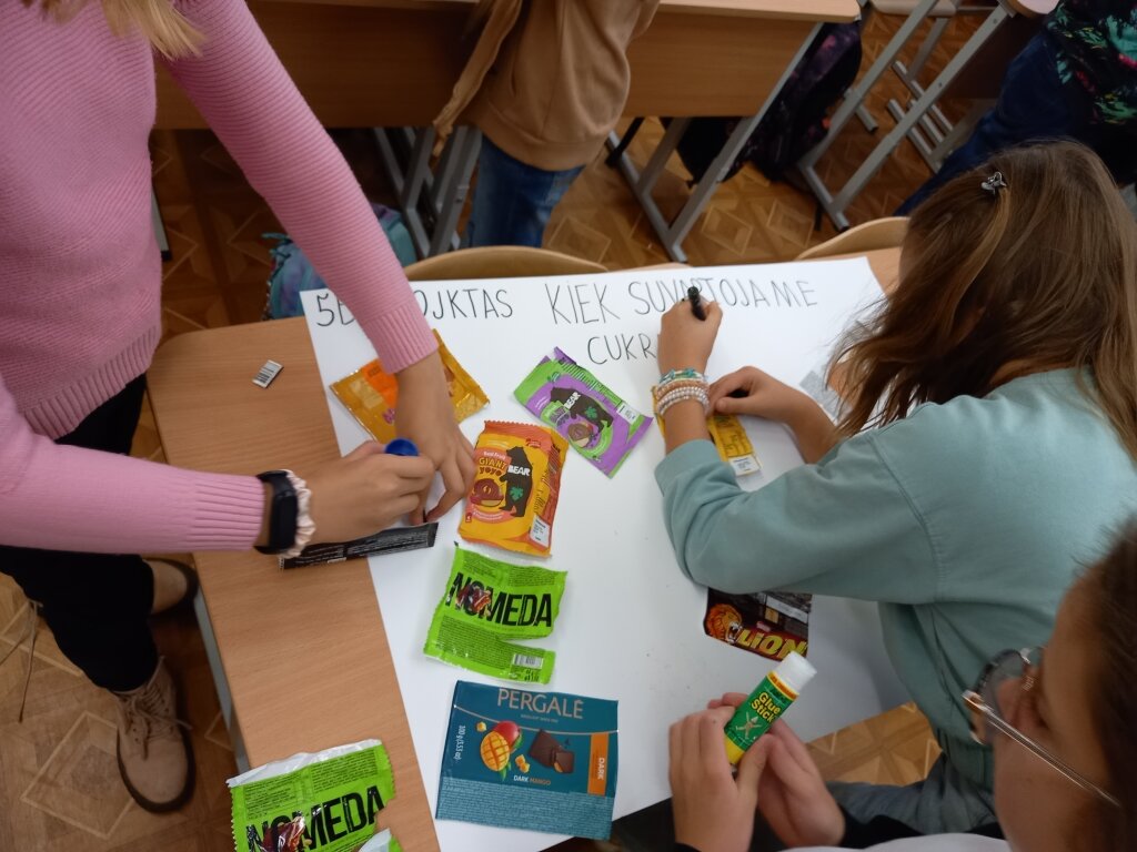 Užsiėmimų metu mokiniai sukūrė vartojamų skanumynų – sūrelių, šokoladų, gėrimų – etikečių koliažą, užrašė pavadinimą ir pristatė klasei. Gimnazijos visuomenės sveikatos specialistė Violeta Kerševičienė pavaizdavo, kiek mokinių pamėgtuose maisto gaminiuose yra gramų cukraus. Didelis cukraus kiekis maisto produktuose sukėlė nuostabą ir diskusijas, tad daugelis pasiryžo pakeisti savo pomėgius. Buvo prieita prie išvados, kad reikėtų vadovautis cukrų mažinimo strategija, kuri padėtų priprasti prie natūralaus skonio – mažinti cukrų vartojimą palaipsniui, kol skonis prisitaikys prie mažesnio cukraus kiekio, ir valgyti kuo daugiau nesaldžių produktų. Svarbu skatinti ir šeimos narius rinktis sveikatai palankius maisto produktus: šviežius vaisius, daržoves, viso grūdo produktus. Daugiau patiems gaminant namuose galima sumažinti pridėtinio cukraus kiekį.
