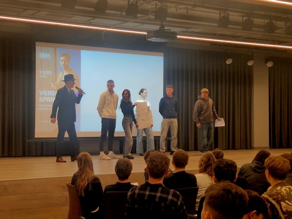 Lapkričio 21 d., žvarbų penktadienio rytą, IIIA gimnazinės klasės mokiniai kartu su klasės auklėtoja, socialine pedagoge Aiste Apyvaliene dalyvavo SMK aukštosios mokyklos organizuotame konkurse „Verslumo sprintas”. Konkurse dalyvavo 19 komandų iš Vilniaus apskrities.