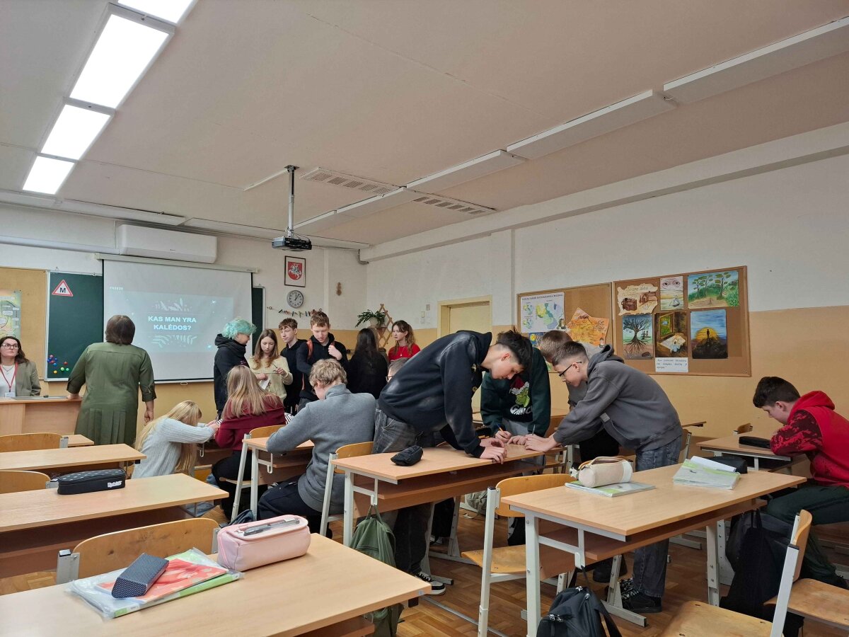 Lietuvių kalbos mokytoja I. Baliūnienė, istorijos mokytoja V. Gildutienė ir edukatorė vedė pamokas tema ,,Kūčių ir Kalėdų papročiai“, kurių tikslas – išsiaiškinti, kokios Kūčių ir Kalėdų tradicijos ir papročiai yra išlikę iki mūsų dienų. Mokiniai klausėsi mokytojų pasakojimo, žiūrėjo vaizdo įrašus, atliko užduotis. Edukatorė Eglė Nedzinskaitė paprašė kiekvieną mokinį internetinėje erdvėje surasti paveiksliuką, kuris labiausiai asocijuojasi su Kalėdine nuotaika ir jį pristatyti. Po pokalbio su mokiniais edukatorė pabrėžė, kad kalėdine tema internete paveiksliukų yra labai daug, bet labai mažai galima rasti dailininkų sukurtų paveikslų. Buvo parodyti du paveikslai, mokinai juos aptarė, taikydami VMS metodą. Pamokų pabaigoje mokiniai parašė projekto refleksiją.