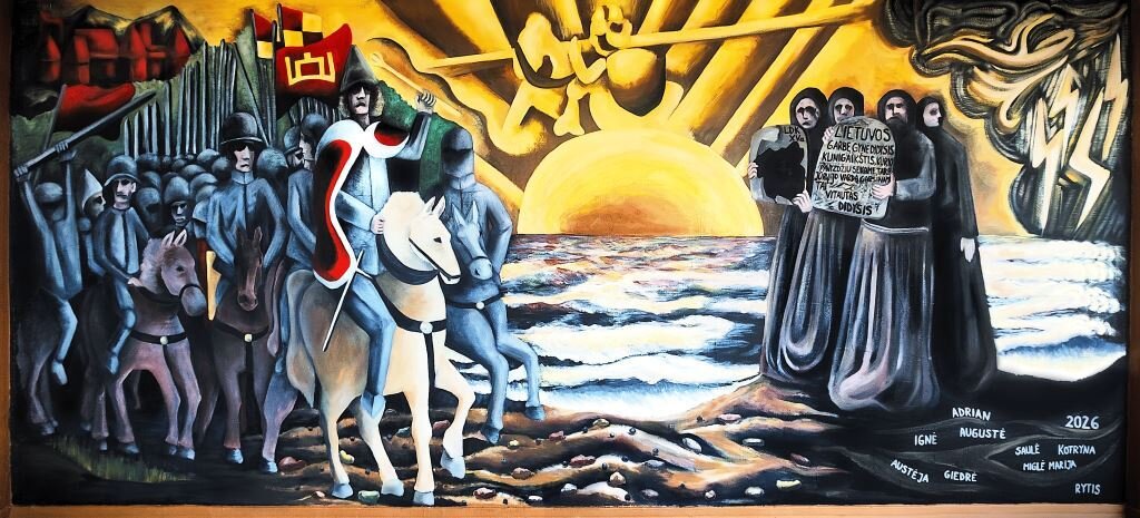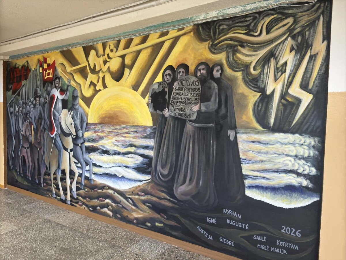 Kovo mėnesio pradžioje mokytojas Rytis Šakys inicijavo sienos paruošimo darbus. IIC klasės mokiniai ją nutinkavo ir nugruntavo. Vėliau prasidėjo piešimo ir tapybos etapas. Suburta komanda laisvalaikiu ir net per pavasario (Velykų) atostogas tapė freską. Potėpis po potėpio – ir ilgai brandinta idėja tapo realybe.