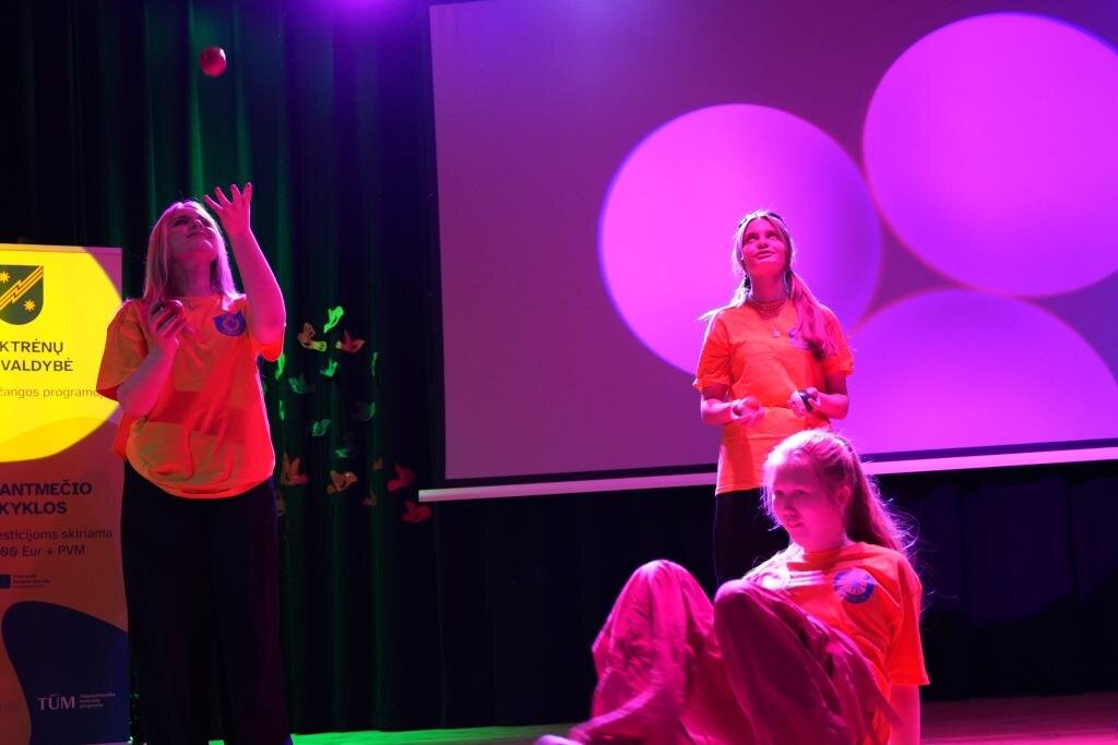 Ilgiausiai – nuo spalio iki kovo mėnesio – keturi gimnazijos menų ir fizinio ugdymo mokytojai su IA klasės komanda įsijungė į veiklą „Šiuolaikinio cirko praktikos mokykloje“. Du kartus per savaitę mokiniai susitikdavo su cirko programos edukatoriumi mokėsi dirbti komandoje, susitarti, atlikti įvairius akrobatikos elementus. Mokiniams šios veiklos tiko ir patiko, jie ne tik išmoko pritaikyti žinias praktikoje, bet ir dirbti komandoje, kūrybiškai spręsti problemas, patyrė daug gerų emocijų. Mokytojai išbandė įvairių mokymo strategijų ir jau jas taiko fizinio ugdymo pamokose. Mokiniai teigė, jog tokios veiklos ne tik praturtino pamokas, kuriose išbandyti šiuolaikiniai metodai, bet ir padėjo atrasti naujus pomėgius bei pasitikėti savo gebėjimais, draugais bei supančia aplinka, susikaupti ir atsipalaiduoti. IA klasės merginos pasirodė ir baigiamojoje konferencijoje. Po pasirodymo dėkojo edukatoriui Kęstui Matusevičiui už įvairius išmoktus cirko elementus ir triukus, supratimą, draugiškumą. Pasak direktoriaus pavaduotojos ugdymui V.Karmazienės, ši programa labiausiai įtraukė įvairių poreikių mokinius, juos subūrė, mokė bendravimo ir bendradarbiavimo, įsiklausyti, atkaklumo ir disciplinos. Dėkojo už gražų pasirodymą baigiamajame TŪM renginyje, kultūringą bendravimą ir bendradarbiavimą.